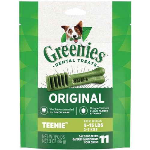 Greenies Teenie Dental Dog Treats are the Original Smart Treat! These delicious, safe and effective dental treats fight plaque and tartar buildup, maintain healthy teeth and gums, and provide fresh breath. With low fat and complete nutrition, they're great for daily feeding.